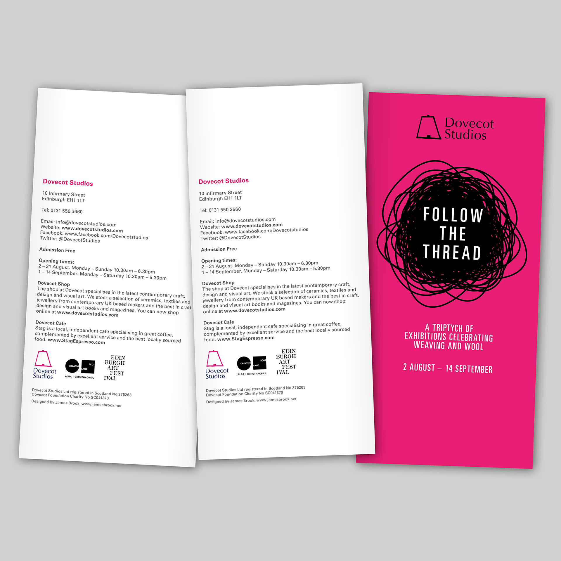 I was invited to create an identity for Follow the Thread, Dovecot Studios’ 2013 Edinburgh Art Festival exhibition. Follow the Thread was a celebration of weaving and wool, with three distinct exhibitions: Fleece to Fibre: The Making of the Large Tree Group Tapestry; Artist Rugs: Dovecot’s Contemporary Rug Collection; and Dazzle@Dovecot. The exhibition ran from 2 August – 14 September, and was accompanied by a series of events, performances and talks.